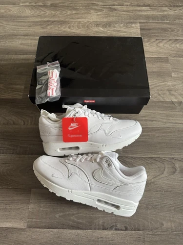This product is a UK size 9, US size 10 Supreme Nike Air Max 1 in white colourway. It is part of Nike's Air product line and is a stylish sneaker designed for men. Released in 2025, this trainer combines the classic Air Max 1 silhouette with the signature Nike Air technology for comfort and performance. This item is in stock and ready to ship, making it a desirable choice for sneaker enthusiasts looking for a reliable and trusted seller.